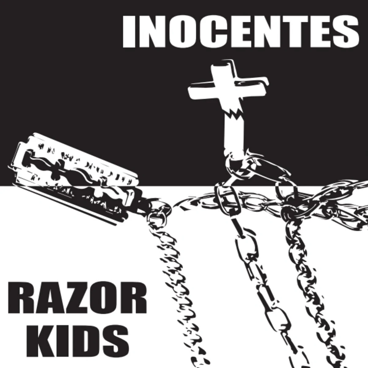 Split LP com uma das bandas Punks brasileiras pioneiras, o quarteto paulista INOCENTES, nos brinda com 6 faixas até então inéditas em vinil. No lado B, temos uma das melhores bandas portuguesas de punk-pub rock. Esse é o segundo 12'' do também quarteto RAZOR KIDS, incluindo uma versão de "Action", The Knots; para fãs de Protex, Eddie Hot Rods, Little Bob Story, Only Ones. Tiragem limitada de 300 cópias, lançada por três selos independentes: Rotten Records, Zerowork Records e Different Class Records.
